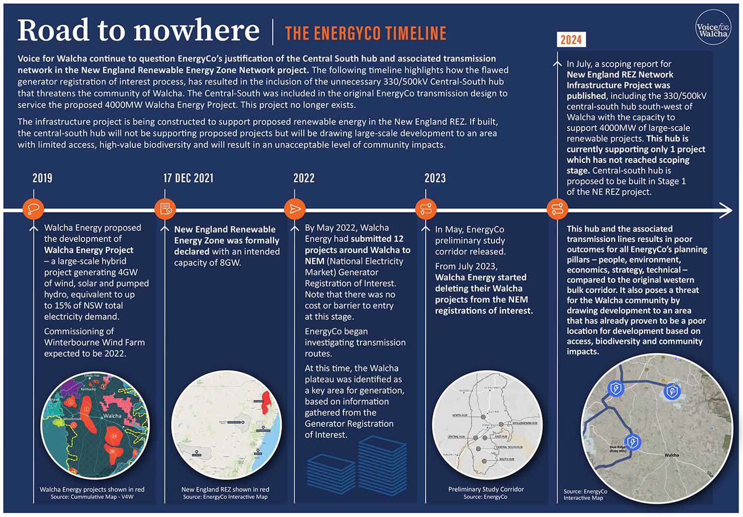 Since Walcha was irresponsibly identified as a site for “4GW of wind energy generation” by a previous project accumulator, Energy Co has had the Walcha Plateau in their sights. Despite the economic reality of wind generation falling away and becoming more and more expensive, compared to Solar and Batteries, Energy Co are reluctant, or unwilling, to update their input parameters to design. A story of this timeline can be viewed below ...